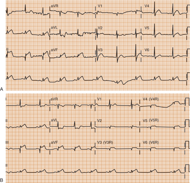 Hình 2. (A) Điện tâm đồ 12 chuyển đạo của một người đàn ông 63 tuổi bị khó chịu ở ngực sau khi chạy trên máy chạy bộ, cho thấy ST chênh lên ở chuyển đạo III lớn hơn ở chuyển đạo II; ST chênh xuống ở chuyển đạo I và aVL; và ST chênh lên ở chuyển đạo aVF lớn hơn ST chênh xuống ở chuyển đạo V2. Các phát hiện này gợi ý nhồi máu cơ tim thất phải. (B) Điện tâm đồ 12 chuyển đạo của cùng bệnh nhân trong (A) sử dụng các chuyển đạo trước tim bên phải, cho thấy đoạn ST chênh lên ở các chuyển đạo V3R đến V6R, phù hợp với nhồi máu cơ tim thất phải.