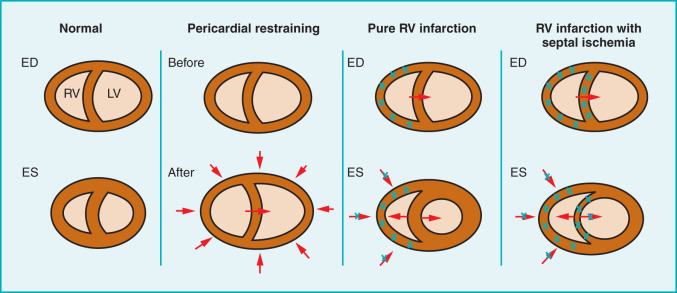 Khái niệm về sự phụ thuộc lẫn nhau giữa các tâm thất trong NMTP là trọng tâm để hiểu sinh bệnh học của tình trạng cung lượng tim thấp. Sự phụ thuộc lẫn nhau giữa các tâm thất được trung gian thông qua màng ngoài tim chung và vách ngăn chung. Vách ngăn là một thành phần không thể thiếu – cả về mặt vật lý và chức năng – đối với thất phải và ngay cả trong điều kiện sinh lý, sự co bóp của vách đóng góp vào hiệu suất thất phải.²² Trong NMTP, giãn thất phải cấp tính xảy ra.¹⁵,¹⁶,²³ Vì thất phải chia sẻ một khoang tương đối cố định với thất trái, áp lực màng ngoài tim tăng đột ngột, dẫn đến suy giảm đổ đầy thất trái. Trong các mô hình động vật có màng ngoài tim được loại bỏ, khó có thể gây hạ huyết áp với NMTP.⁸ Tuy nhiên, khi màng ngoài tim được giữ nguyên vẹn,¹⁶,²⁴ NMTP có liên quan đến hội chứng đầy đủ, như được mô tả ban đầu bởi Cohn và cộng sự.¹² Rạch màng ngoài tim dẫn đến cải thiện cung lượng tim, cân bằng áp lực và tăng áp lực tâm thu thất phải.¹⁶