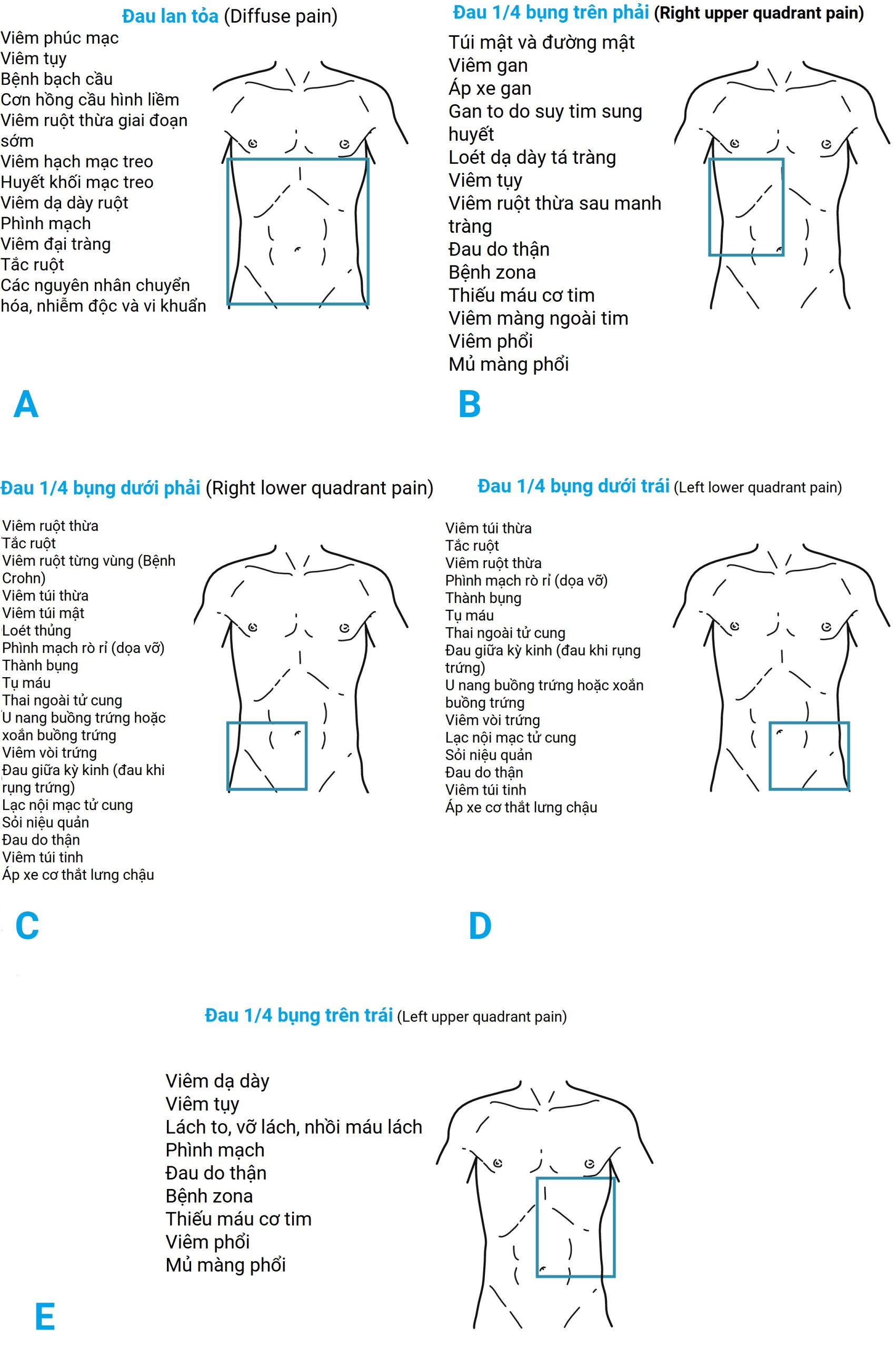 Hình 1.1 Vị trí đau bụng đặc trưng liên quan đến các bệnh khác nhau.