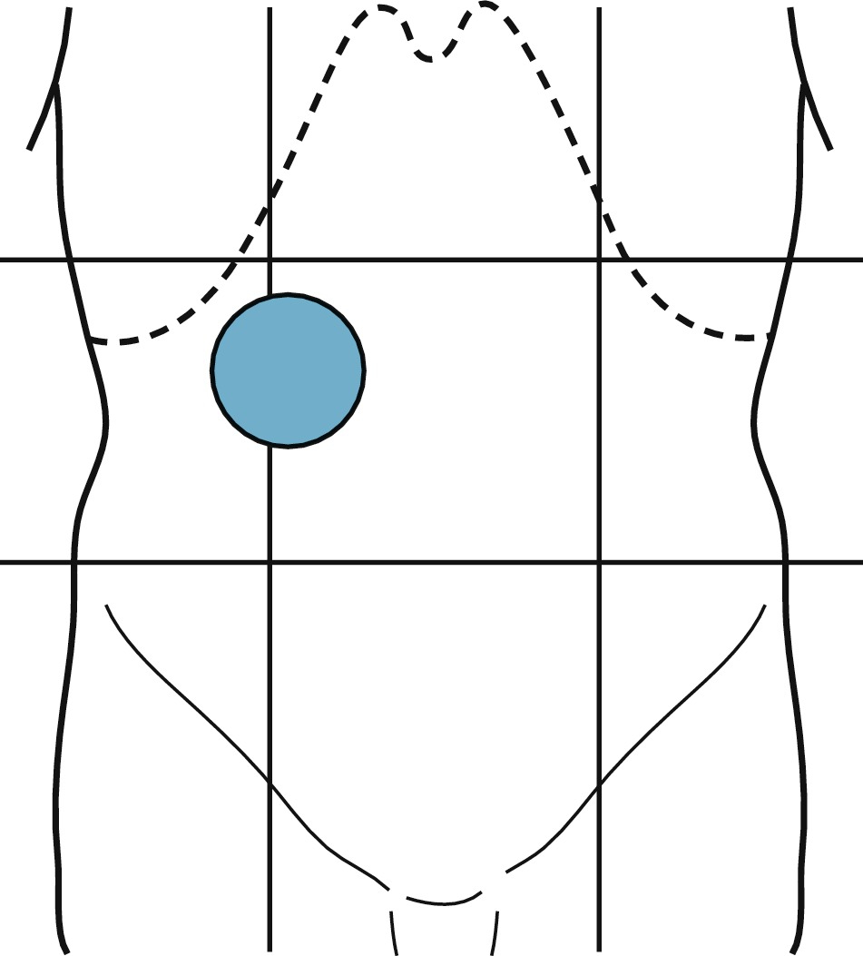 Vị trí của cơn đau là một trong những dấu hiệu tốt nhất để xác định chẩn đoán (Hình 1.1). Đau RUQ thường thấy nhất trong viêm túi mật, sỏi mật, và thủng loét tá tràng (Hình 1.2). Một manh mối khác của bệnh túi mật là cơn đau RUQ lan đến góc dưới xương vai phải. Đau RUQ cũng được thấy ở bệnh nhân viêm gan hoặc suy tim sung huyết. Ở nhóm sau, cơn đau được cho là do gan sưng lên, dẫn đến căng bao Glisson. Nhồi máu cơ tim có thể biểu hiện bằng đau RUQ. Đau RUQ ít nghiêm trọng hơn có thể thấy ở bệnh nhân bị hội chứng góc gan (kẹt hơi ở góc gan của đại tràng). Nếu được hỏi kỹ, những bệnh nhân này sẽ thừa nhận cảm thấy giảm đau khi trung tiện.
