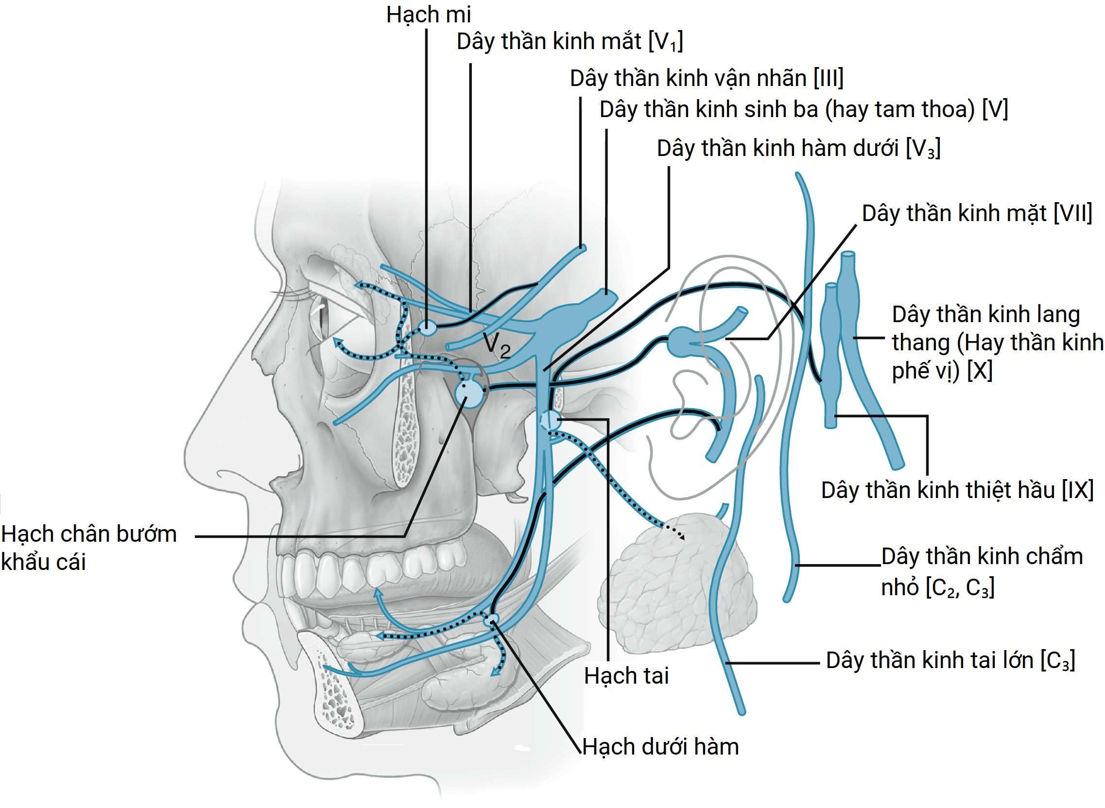 19 | Trigeminal nerve (auriculotemporal nerve) | /traɪˈdʒemɪnl nɜːrv/ | Dây thần kinh sinh ba (dây thần kinh tai-thái dương) |