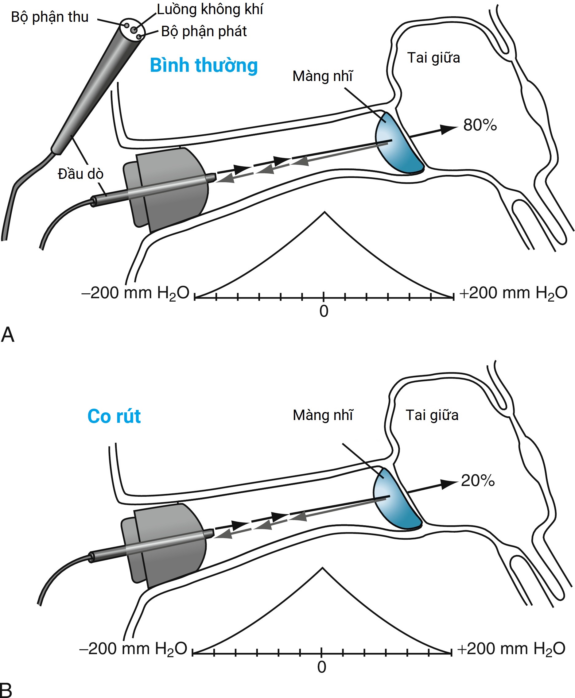 Hình 12.3 Lý thuyết đo nhĩ lượng. A, Bình thường. Âm dò tần số thấp (220-Hz) được phát ra từ một lỗ nhỏ ở đầu dò và hướng đến màng nhĩ. Khi màng nhĩ bị làm cứng bởi áp suất dương hoặc âm, một lượng lớn năng lượng âm thanh bị phản xạ khỏi màng và hướng trở lại ống tai. Một micro nhỏ được đặt trong bộ phận dò đọc lượng năng lượng âm thanh phản xạ. Khi màng nhĩ ở vị trí trung tính, áp suất trong tai giữa bằng với áp suất khí quyển và do đó ở vị trí di động nhất. Ở đây, hầu hết năng lượng âm thanh từ âm dò được màng nhĩ hấp thụ vào tai giữa, và lượng ít nhất được phản xạ xuống ống tai. B, Co rút. Màng nhĩ co rút phản ánh áp suất âm trong tai giữa so với áp suất khí quyển. Vị trí mềm nhất của màng (đỉnh của biểu đồ nhĩ lượng) được tìm thấy khi áp suất âm được tạo ra nhân tạo từ áp kế của dụng cụ. Do đó, điểm áp suất mà tại đó đỉnh của biểu đồ nhĩ lượng xảy ra đại diện cho một phép đo gián tiếp của áp suất tai giữa. Lưu ý rằng năng lượng âm thanh lớn hơn được phản xạ khỏi màng nhĩ cho đến khi áp suất được đưa xuống ống tai bằng với áp suất trong tai giữa (trong trường hợp này là − 200 mm H2O).