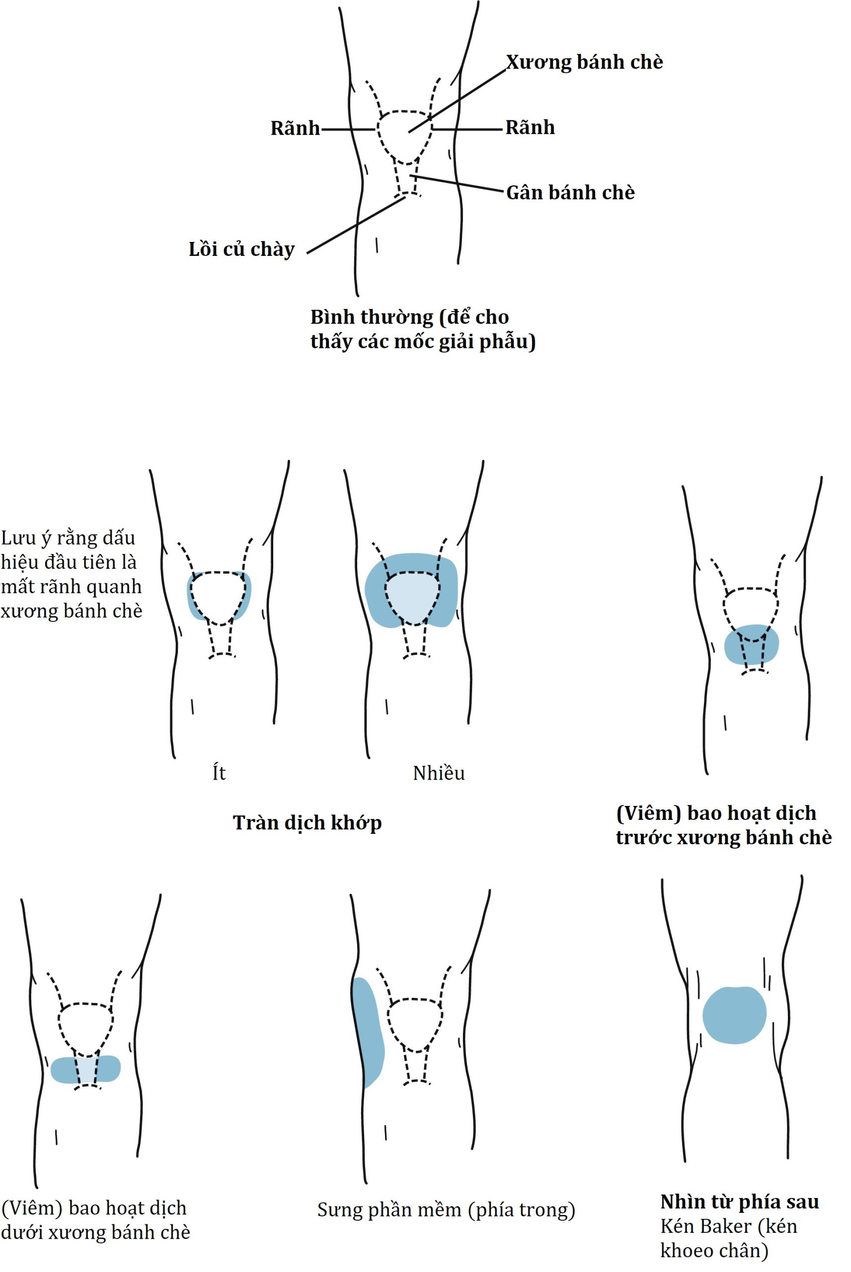 Khi một bệnh nhân phàn nàn về đau ở đầu gối, khớp nên được sờ nắn (Hình 24.324.4). Đau ở đường khớp gợi ý tổn thương các dây chằng bên trong hoặc bên, dây chằng bao khớp hoặc sụn chêm. Chụp X-quang, chụp cộng hưởng từ (MRI) và nội soi khớp có thể cần thiết để chẩn đoán chính xác. Sự ổn định của các dây chằng gối nên được xác định bằng cách khám thực thể cẩn thận (Hình 24.524.6). Đau trên hoặc dưới đường khớp gợi ý một vết kéo hoặc căng cơ (Hình 24.7). Với các vết rách cơ cấp tính, thường có đau tại chỗ, bầm tím và có thể có một khoảng trống trong cơ.