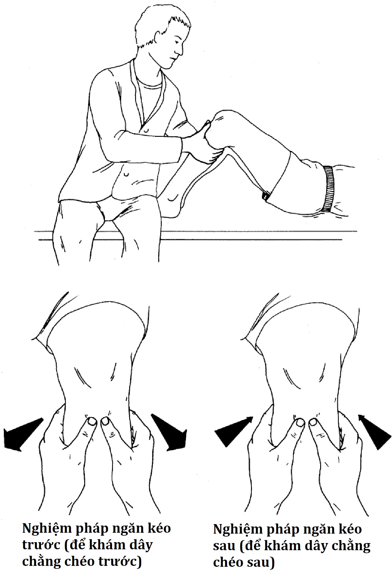 Hình 24.6 Các nghiệm pháp ngăn kéo để đánh giá sự ổn định của dây chằng chéo.