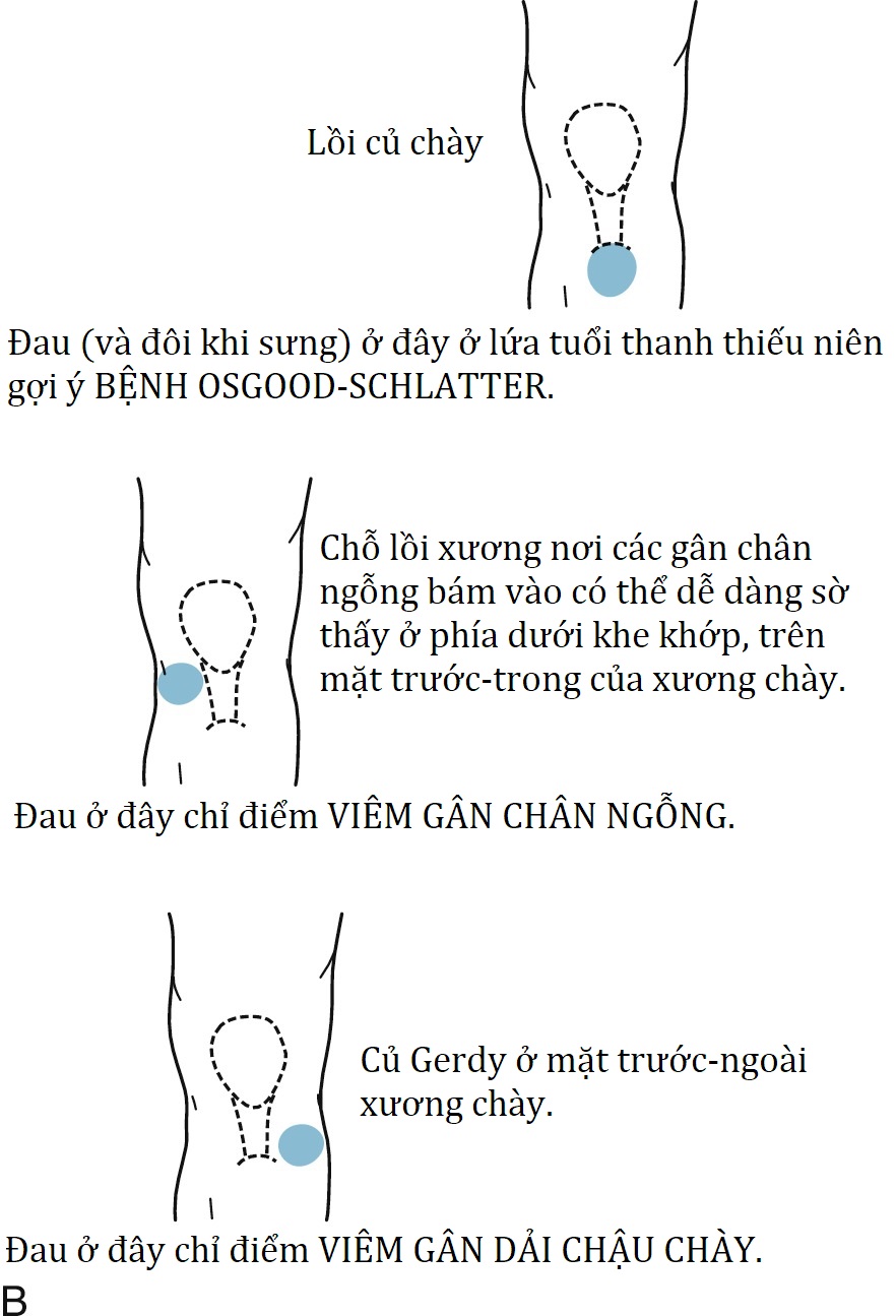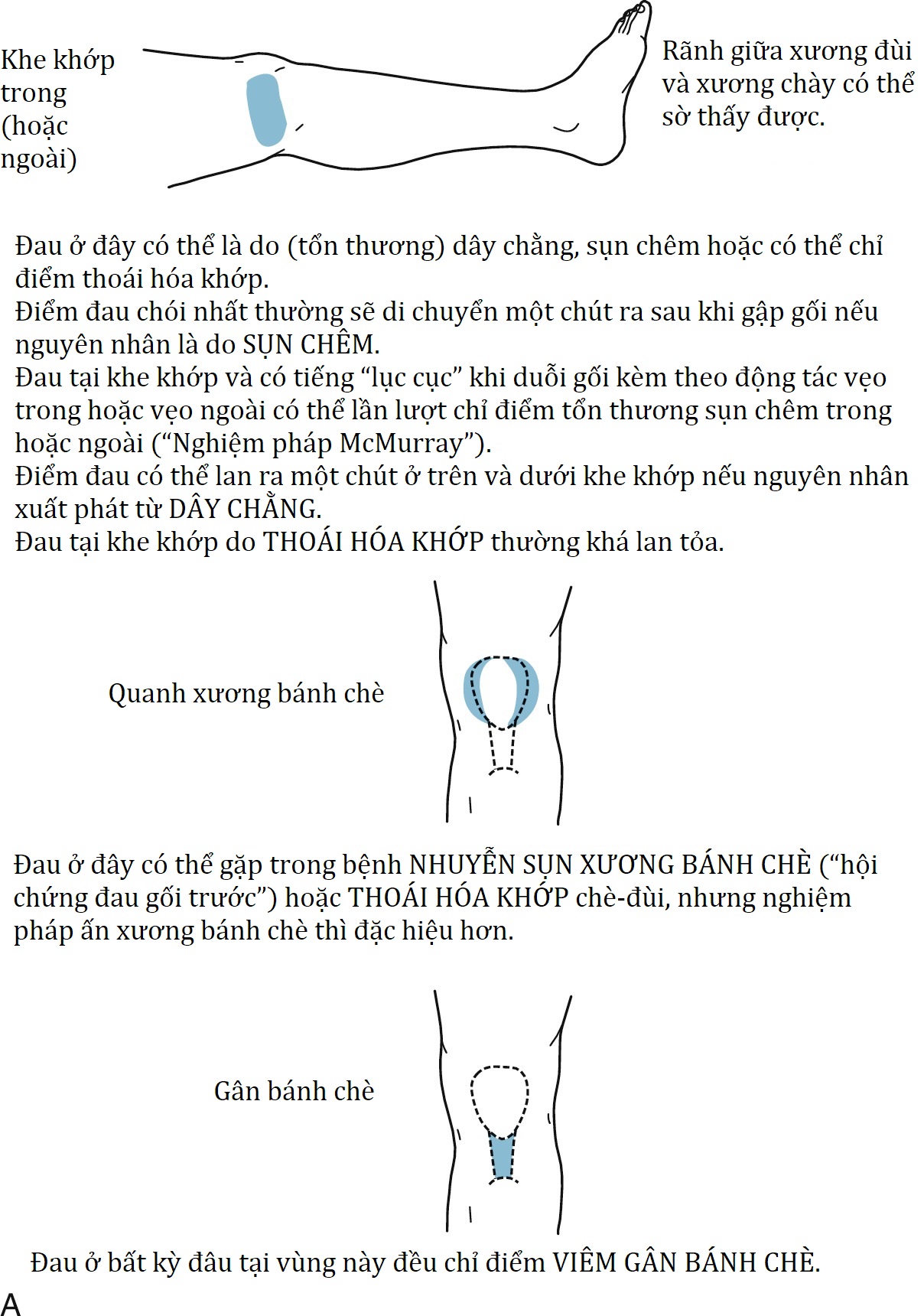 Hình 24.7 Các vị trí đau quanh đầu gối.