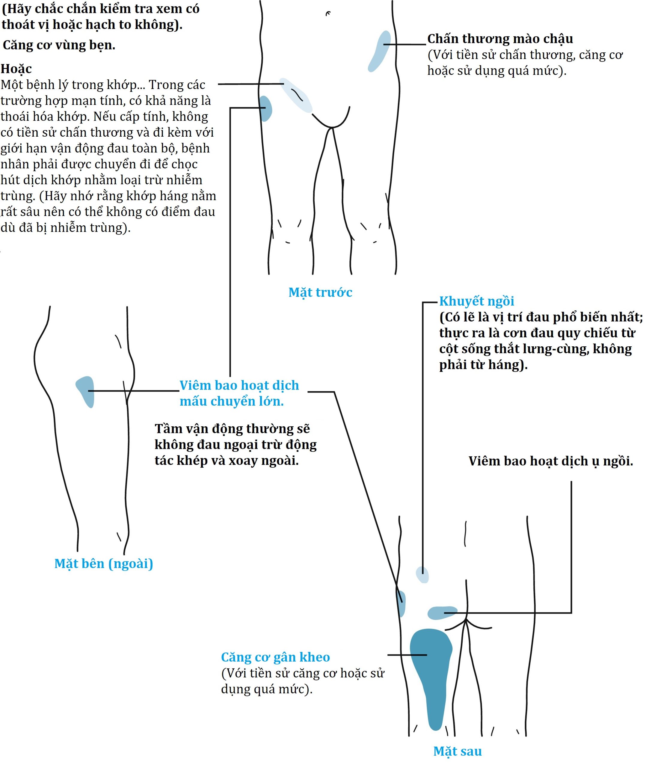 Ở bệnh nhân từ 50 tuổi trở lên, đau bắp chân do đi bộ hoặc tập thể dục và giảm khi nghỉ ngơi rất có thể là do suy động mạch ngoại vi (bệnh động mạch ngoại vi) (peripheral arterial insufficiency (peripheral artery disease)). Đau ở háng do đau cách hồi được thấy ở bệnh nhân bị bệnh động mạch chủ-chậu. Khi đau bắp chân do vận động xảy ra ở người trẻ tuổi, thường có tiền sử viêm tắc tĩnh mạch, đau cách hồi tĩnh mạch (venous claudication) là có thể xảy ra. Bệnh gút phổ biến nhất ở nam giới lớn tuổi nhưng có thể xảy ra ở phụ nữ, đặc biệt là những người đã mãn kinh sớm (tự nhiên hoặc do phẫu thuật). Bệnh nhân bị bệnh gút có thể có hoặc không có tiền sử gia đình về tình trạng này. Thường có thể khai thác được tiền sử một cơn đau trước đó. Đau gút kinh điển xảy ra ở ngón chân cái, nhưng nó có thể xảy ra ở các ngón chân khác hoặc mắt cá chân hoặc đầu gối; nó hiếm khi xảy ra ở háng.