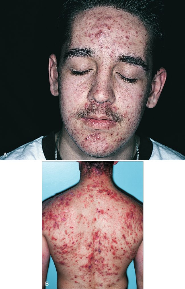Hình 29.1 Mụn trứng cá thông thường (Acne vulgaris) ở (A) mặt và (B) bệnh vảy nến thể mủ (pustular psoriasis) ở lưng.