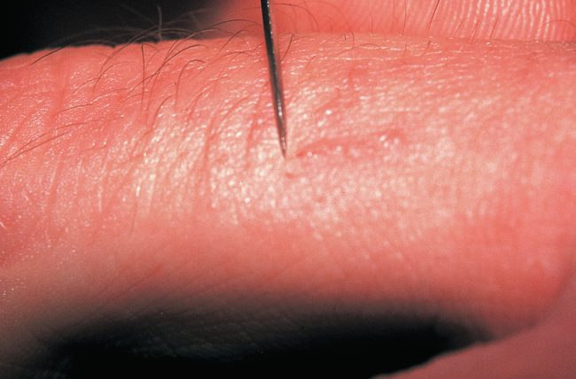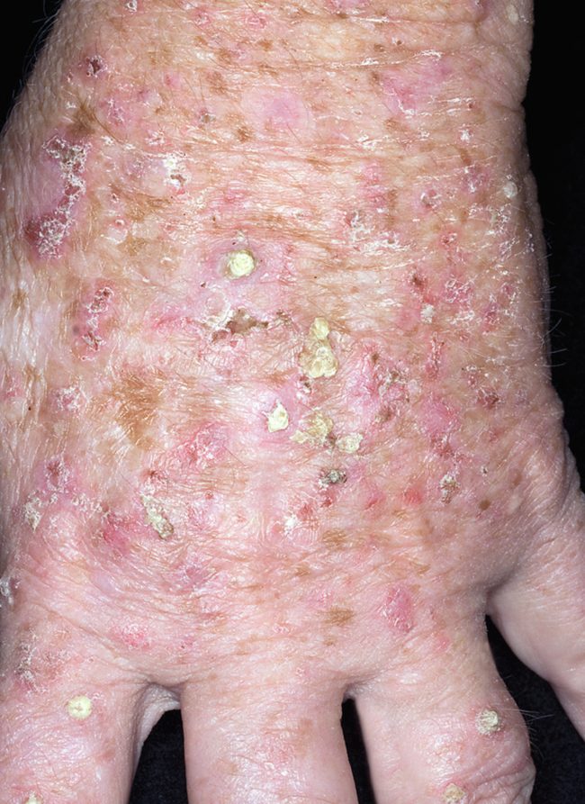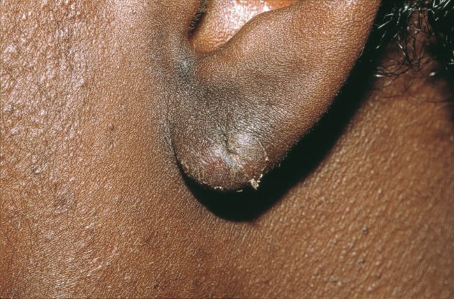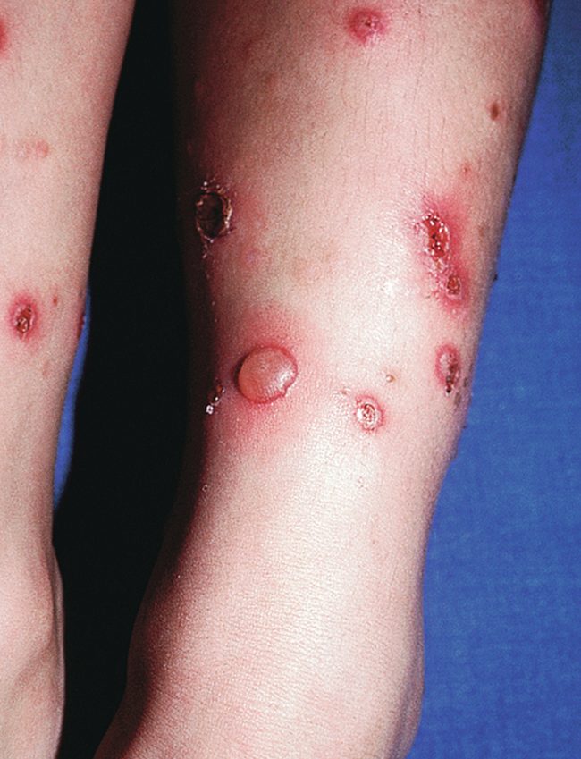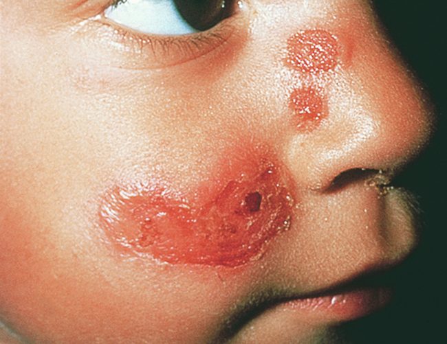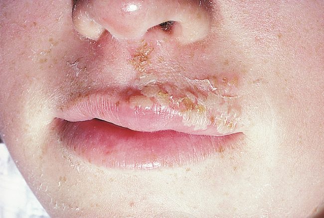 Hình 29.2 Chốc lở (Impetigo). Lưu ý sự tiết dịch huyết thanh và đóng vảy. Vì chốc lở có tính lây lan, nó có thể lây sang người khác và các bộ phận khác của cơ thể. Bệnh thường do Staphylococcus aureus và ít thường xuyên hơn là do Streptococcus pyogenes (tan huyết).