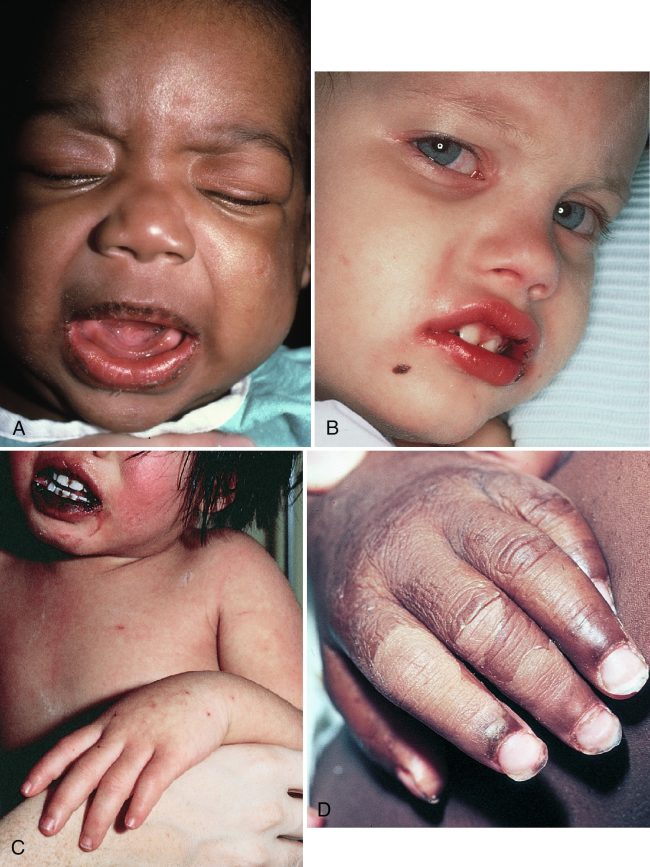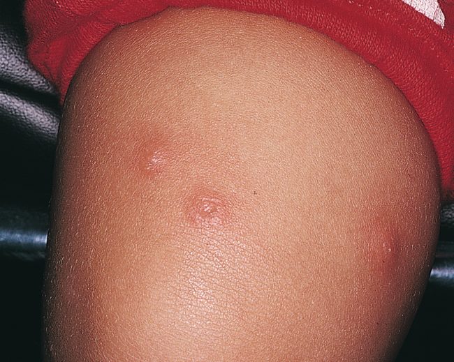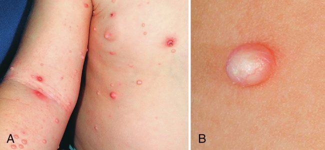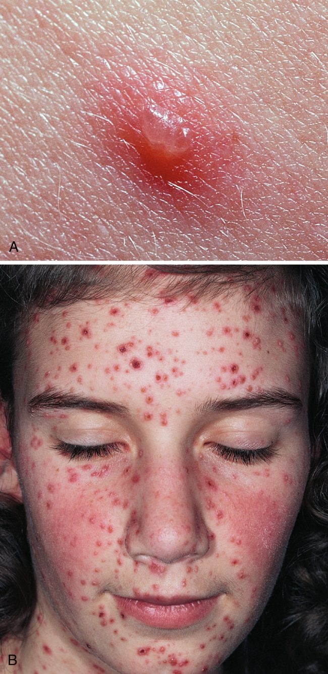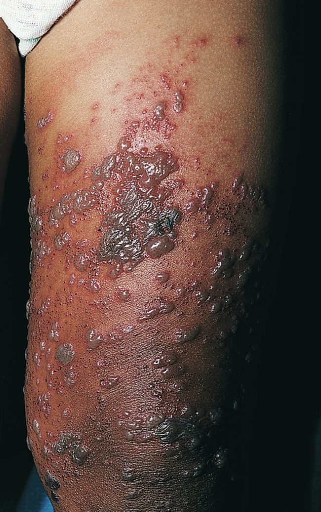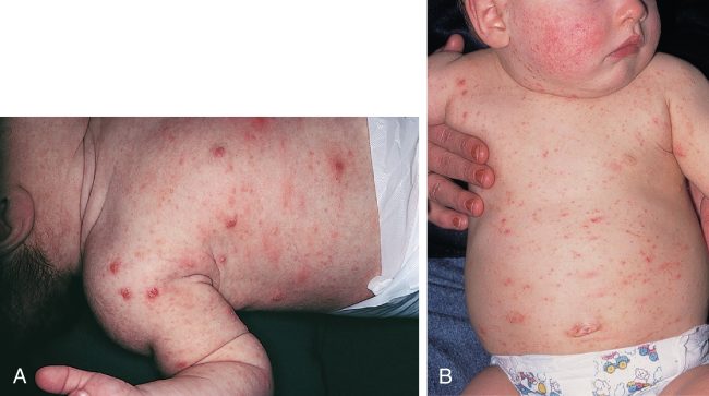 Sẩn, mụn nước và mụn mủ Mặt, đầu và cổ. Thỉnh thoảng ở vùng tã lót ở trẻ sơ sinh Rỉ dịch, vảy màu mật ong Chủ yếu là trẻ em U mềm lây, viêm nang lông Chốc lở