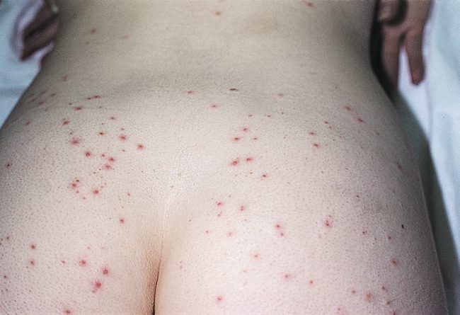 Hình 29.5 Viêm nang lông do bồn nước nóng (Hot tub folliculitis). Các sẩn và mụn mủ do nhiễm Pseudomonas.