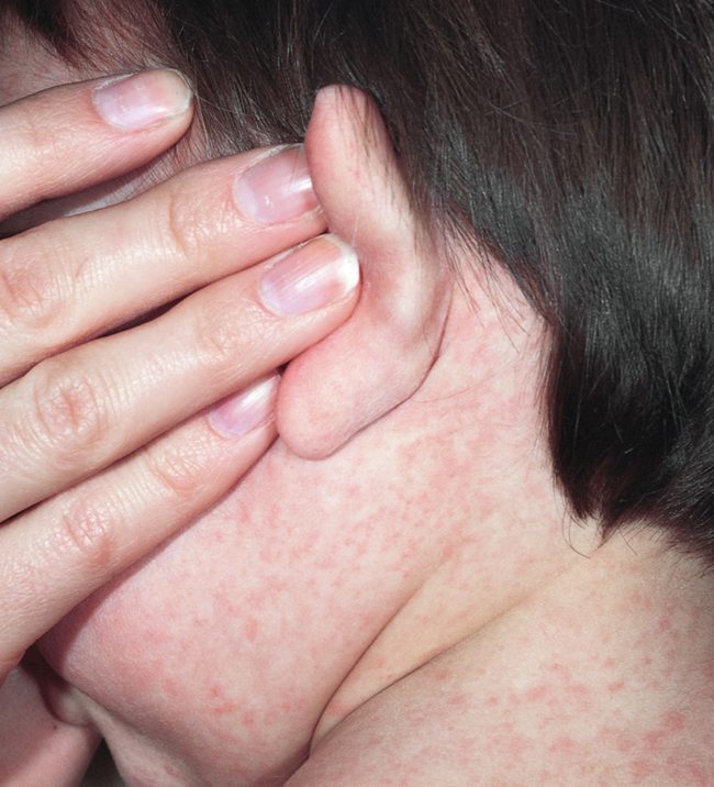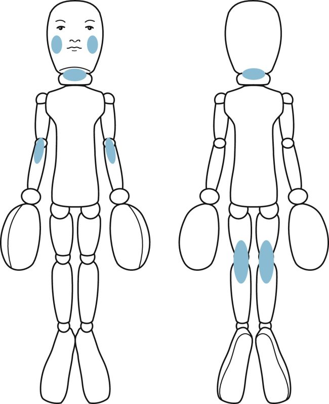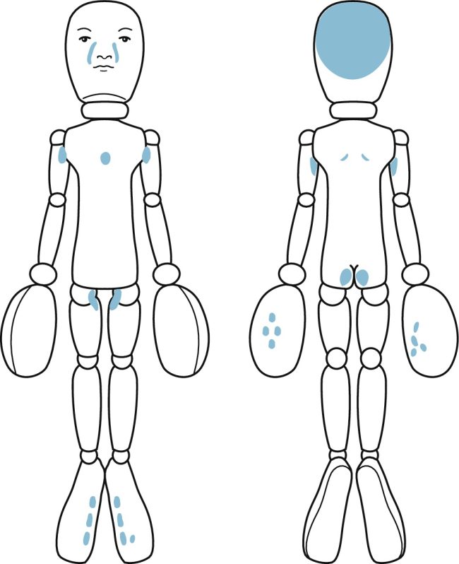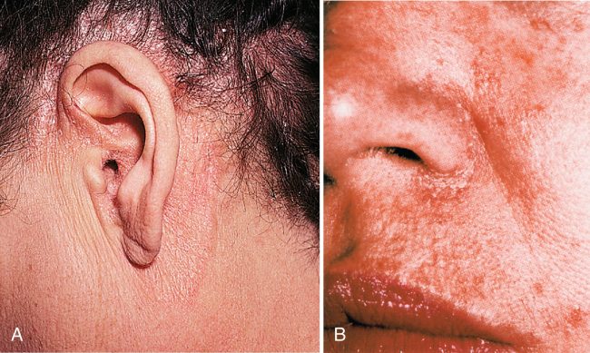Hình 29.6 Các vùng ngứa bị lichen hóa ở các vùng nếp gấp và trên mặt là những vị trí điển hình của viêm da cơ địa (atopic dermatitis) ở người lớn.