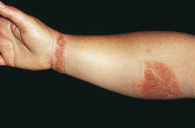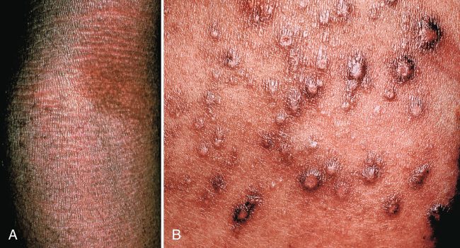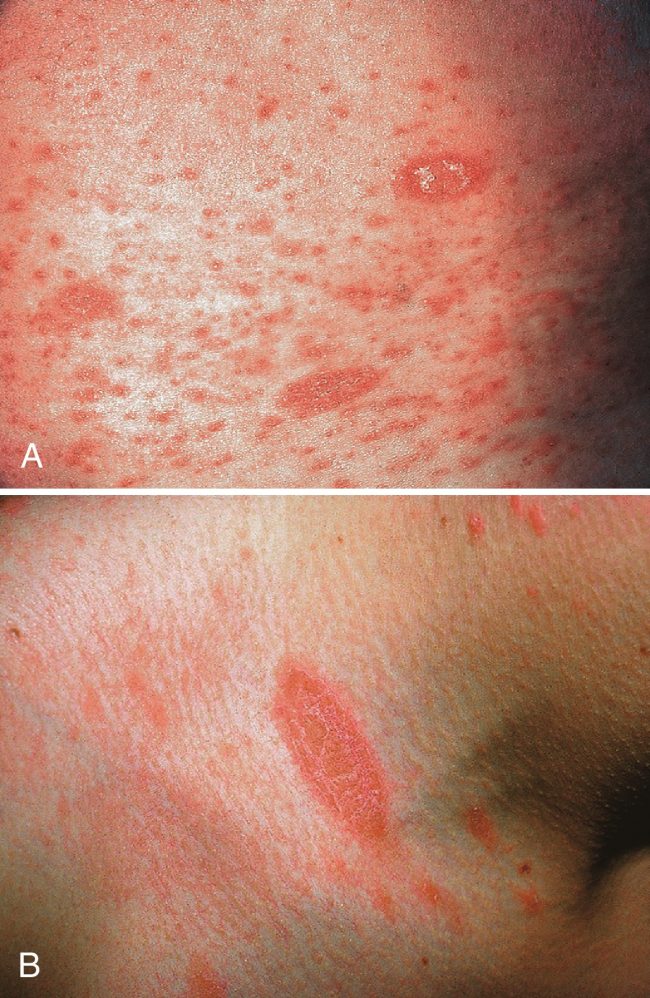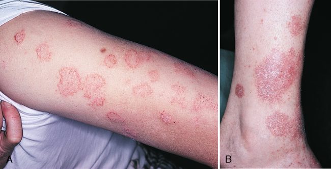 Hình 29.10 Chàm đồng xu (Nummular eczema) ở (A) cánh tay và (B) mắt cá chân.