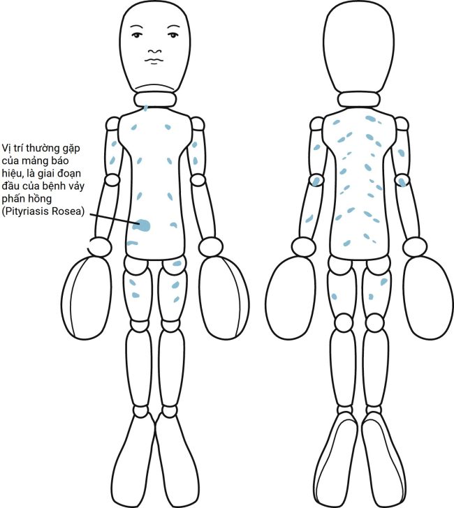 Các mảng hoặc dát vảy Thân mình và các chi gần Mảng báo trước (2 × 6 cm), thường ở thân mình, có trước tổn thương toàn thân. Phổ biến hơn vào mùa đông. Màu cá hồi. Có thể ngứa. Các dát hình bầu dục (1 × 2 cm) với trục dài dọc theo các đường da, tạo thành dạng cây thông Noel. Vảy viền Trẻ em. Người lớn trẻ tuổi Nấm. Bệnh vảy nến. Giang mai thứ phát. Phát ban do thuốc Bệnh vảy phấn hồng