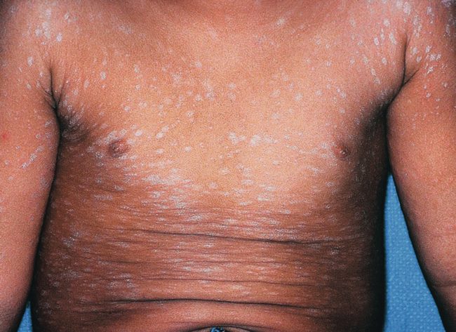 74 Tinea versicolor (pityriasis versicolor) /ˈtɪniə ˈvɜːrsɪkʌlər/ Lang ben