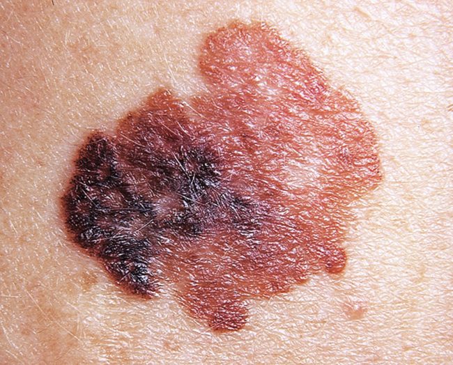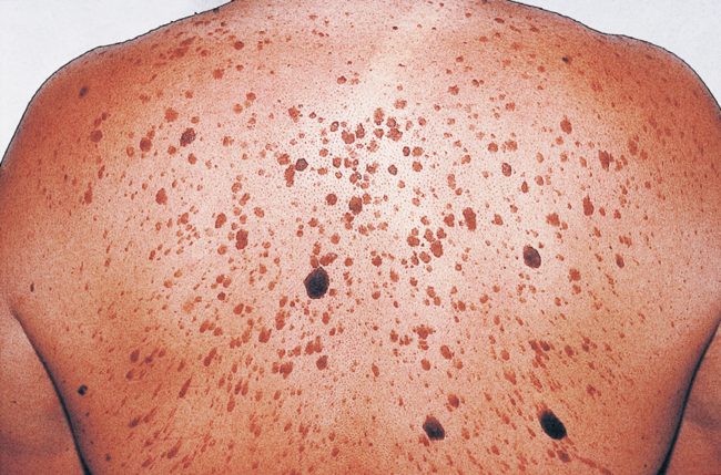 Nam giới: chủ yếu ở thân mình (47%). Phụ nữ: chủ yếu ở chân (39%) Sắc tố, thường có các màu khác nhau trong cùng một tổn thương (xanh, tím, trắng, nâu vàng). Bờ không đều. Thay đổi kích thước. Các vệ tinh Người lớn Nốt ruồi (u tế bào hắc tố). Các tổn thương sắc tố. Dày sừng tiết bã. U xơ da. U mạch sừng hóa. Đồi mồi U hắc tố ác tính