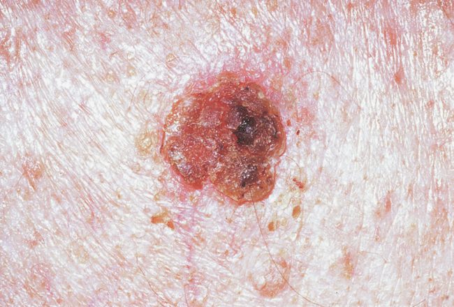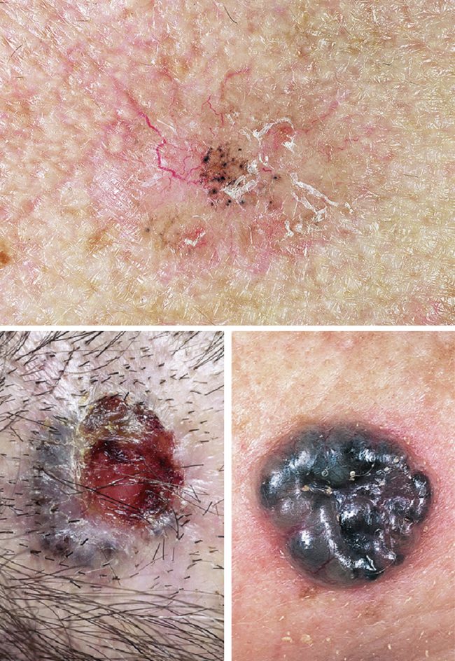 Khối u Phổ biến nhất ở mặt và các vùng tiếp xúc với ánh nắng mặt trời khác Bề mặt nhẵn. Trung tâm teo. Bờ ngọc trai. Hình tròn. Màu nâu vàng. Mao mạch giãn ở bờ Người già. Những người thường xuyên tiếp xúc với ánh nắng mặt trời Ung thư tế bào vảy. U hắc tố. U tuyến bã Ung thư biểu mô tế bào đáy