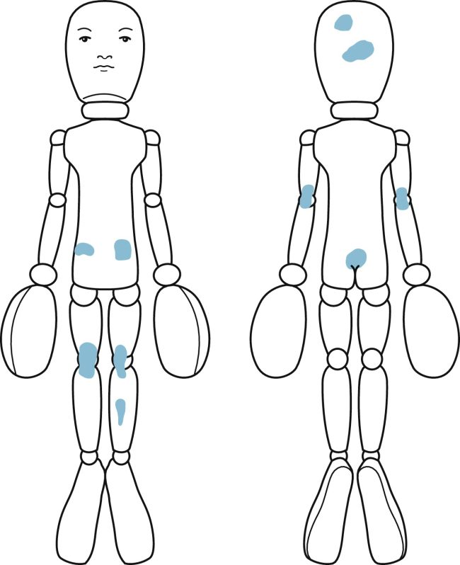 Có sự phân bố theo khoanh da Chân là vị trí phổ biến nhất ở trẻ em Ngứa ran. Thỉnh thoảng ngứa. Đau (thường không ở trẻ em). Thường phân bố theo dây thần kinh tọa Người lớn và trẻ em Viêm da tiếp xúc (thường ngứa). Viêm mô tế bào Herpes zoster
