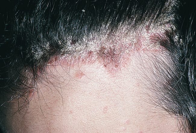 Các dát vảy Da đầu. Lông mày. Nếp mũi má. Giữa ngực. Rốn Vảy vàng, nhờn. Vảy nhờn với bờ kém rõ. Một số ban đỏ Phổ biến hơn ở người lớn. “Cứt trâu” ở trẻ sơ sinh Gàu với ít ban đỏ; không có các vùng khác bị ảnh hưởng. Bệnh vảy nến liên quan đến các bề mặt duỗi. Bệnh vảy nến ở da đầu thường dừng lại ở chân tóc với các mảng được xác định rõ Viêm da tiết bã