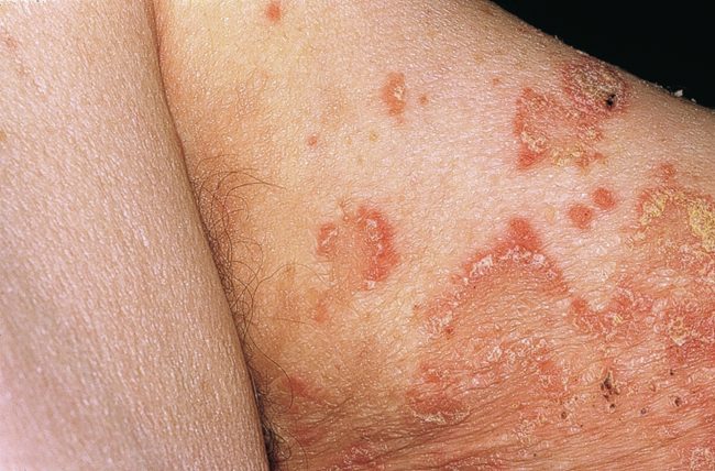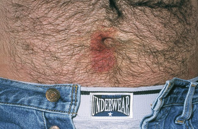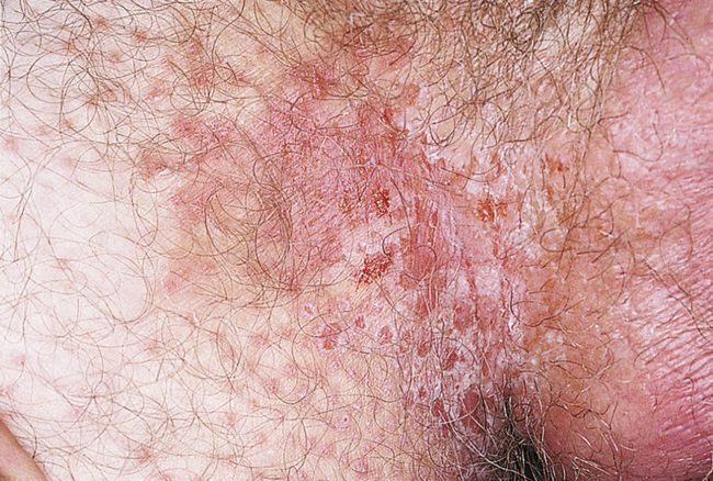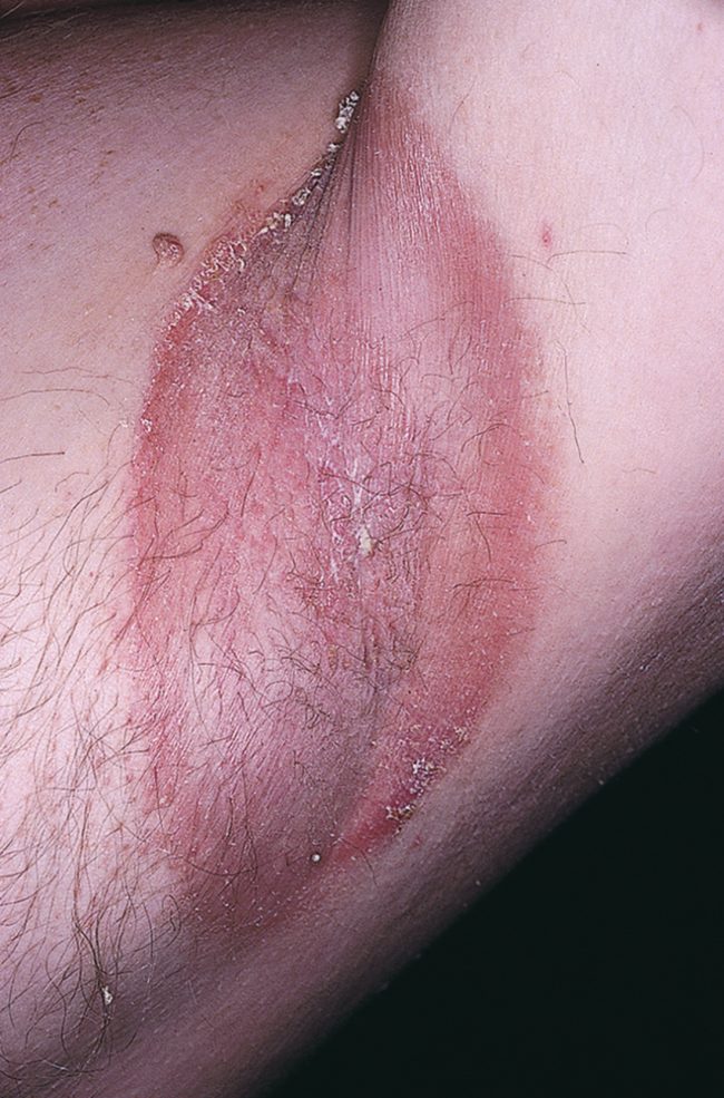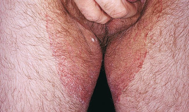 Ban đỏ. Một số vảy. Thỉnh thoảng bị nứt nẻ và rỉ dịch Bẹn Bờ không rõ; mụn mủ ở rìa. Xét nghiệm KOH dương tính. Ẩm Trẻ em. Bệnh nhân tiểu đường Tất cả có thể trông giống nhau (cần xét nghiệm KOH để phân biệt) Bệnh nấm Candida. Hăm tã
