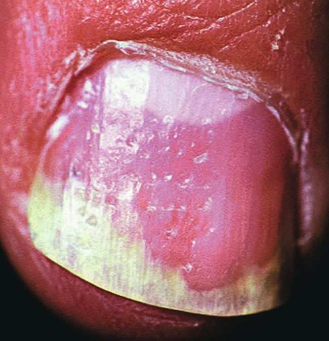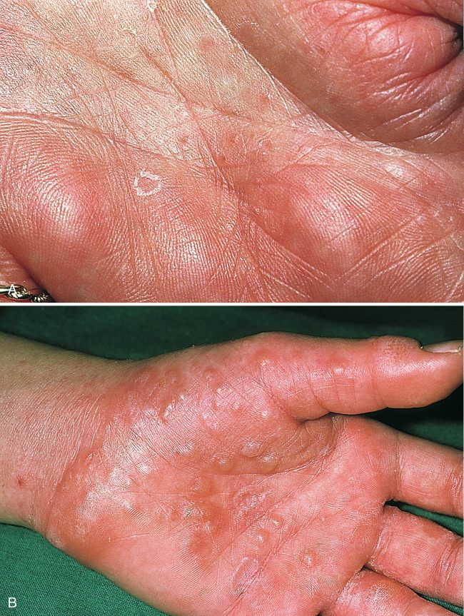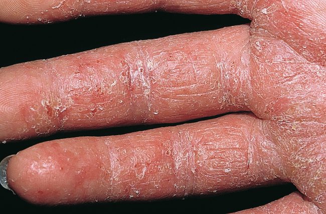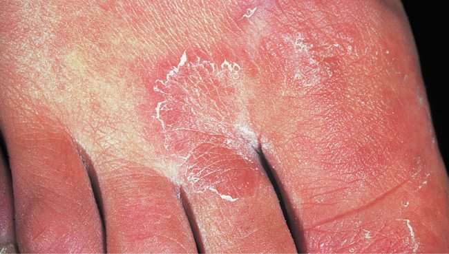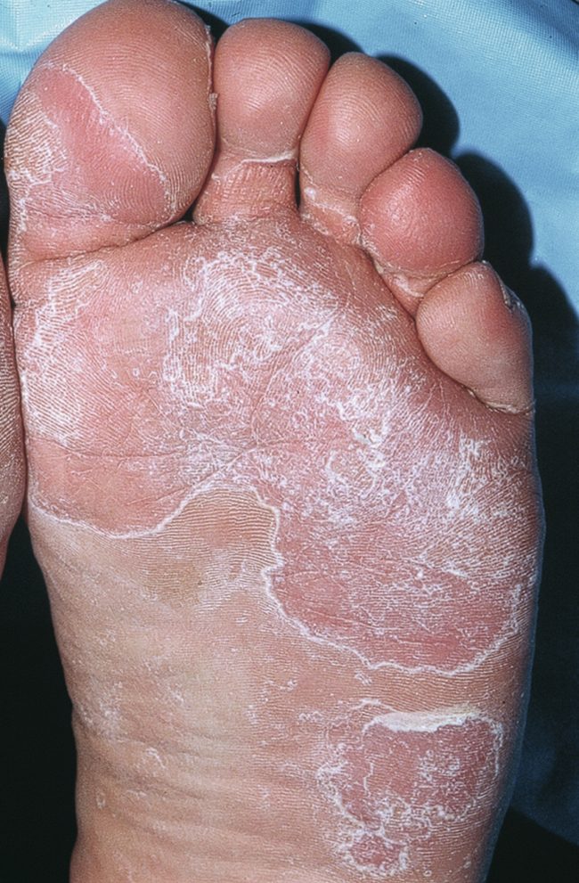 Vảy Mặt hoặc bàn chân (lòng bàn chân) Ban đỏ và nứt nẻ. Xét nghiệm KOH âm tính; không ảnh hưởng đến kẽ ngón chân Trẻ em Viêm da lòng bàn chân ở trẻ vị thành niên