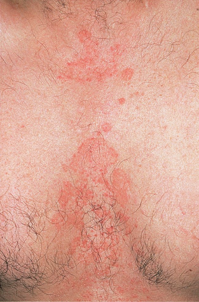 Bẹn Bờ rõ. Phản ứng ánh sáng Wood dương tính (màu đỏ san hô). Các dát màu nâu đỏ Thường làm phức tạp phát ban herpes đơn giản. Phổ biến hơn ở nam giới. Không thấy ở trẻ em. Người lớn béo phì. Người lớn Hăm kẽ do tiết bã. Erythrasma (Corynebacterium)