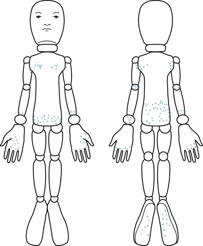 Sẩn bị viêm, có trầy xước và đóng vảy. Các đường hầm thẳng không phải lúc nào cũng được nhìn thấy Kẽ ngón tay. Cổ tay. Nếp gấp khuỷu tay. Khuỷu tay. Quầng vú. Rốn. Bụng dưới. Bộ phận sinh dục. Rãnh gian mông Ngứa (nặng hơn vào ban đêm). Trầy xước. Rỉ nước. Những người khác trong gia đình có thể có cùng vấn đề Người lớn và trẻ em Bệnh rận mu. Trứng rận bám vào tóc. Rận thường được nhìn thấy trên da Bệnh ghẻ