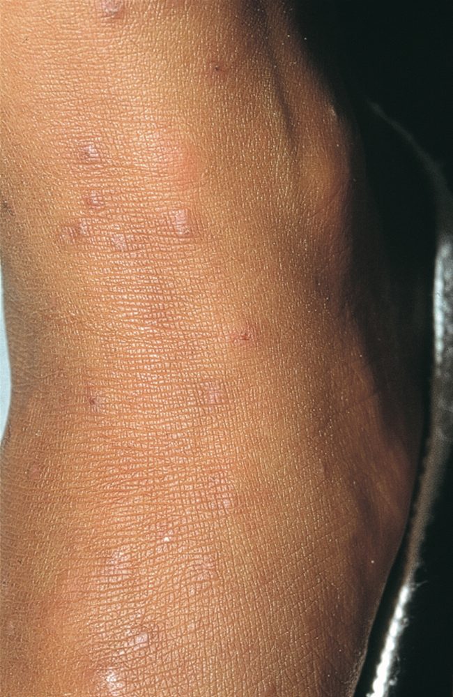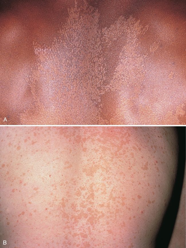 Hình 29.8 Viêm da cơ địa (Atopic dermatitis): các tổn thương đặc trưng. A, Lichen hóa và dày lên, hố khuỷu tay. B, Các sẩn giống sẩn ngứa trong viêm da cơ địa ở người lớn.