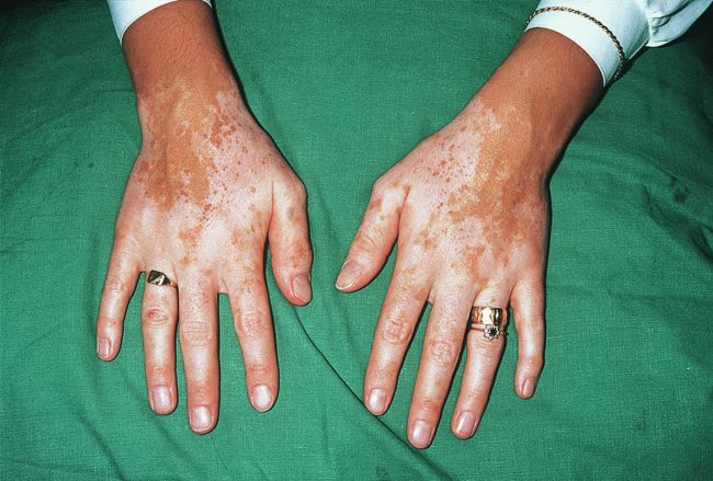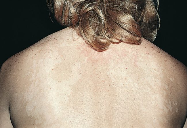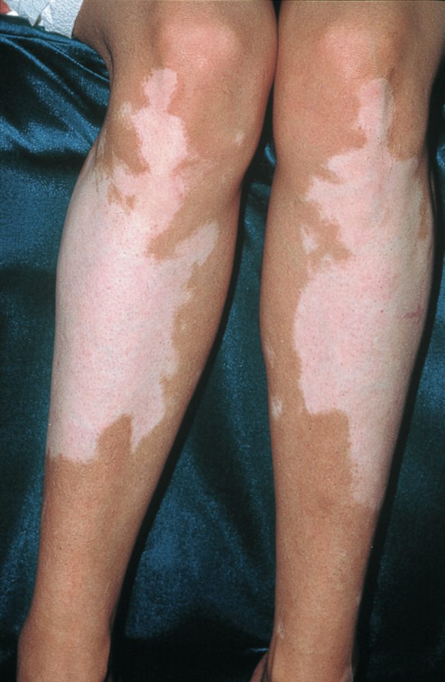 Mất sắc tố Các lỗ tự nhiên. Mắt. Các bề mặt duỗi. Các vùng bị chấn thương Phản ứng ánh sáng Wood dương tính (màu trắng sáng). Tỷ lệ gia đình tăng Có tính gia đình. Bệnh tuyến giáp. Bệnh Addison Giảm sắc tố sau viêm. Lang ben trắng. Tiếp xúc với các hợp chất phenolic Bệnh bạch biến