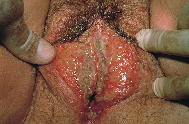 Có nền ban đỏ Vùng sinh dục Đau, không ngứa. Xét nghiệm Tzanck dương tính Người lớn. Trẻ sơ sinh Viêm da tiếp xúc cấp tính Herpes sinh dục (simplex II)