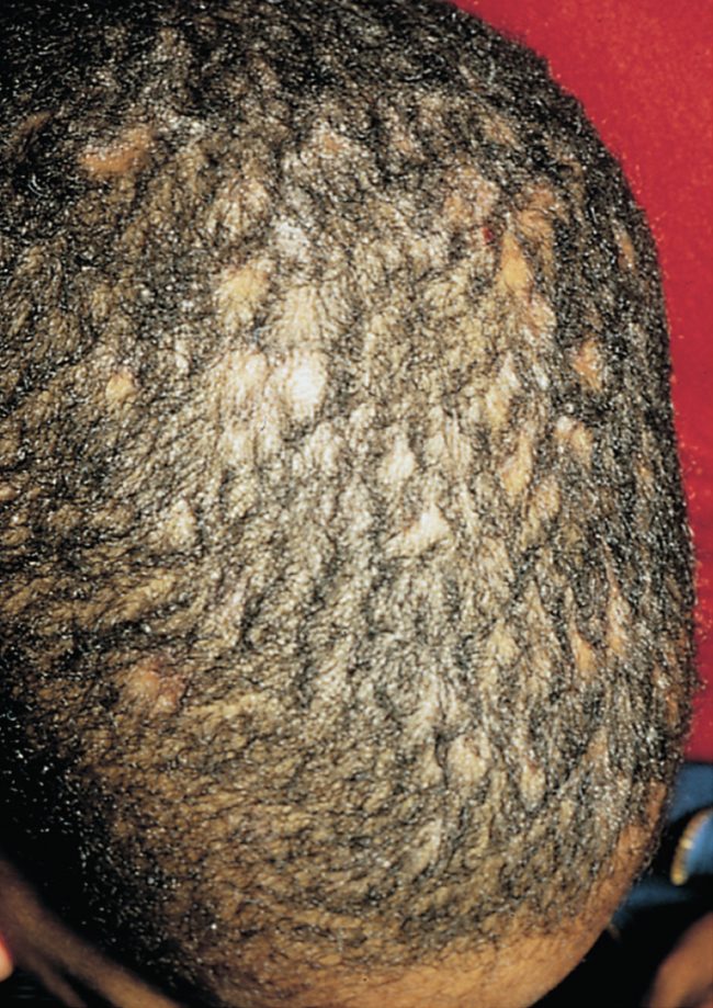 Rụng tóc từng mảng Da đầu Tóc bị gãy và ngắn. Xét nghiệm KOH dương tính. Không phát quang. Nuôi cấy trong môi trường thử nghiệm nấm da (DTM). Microsporum audouiniicanis cho phản ứng ánh sáng Wood màu xanh táo Trẻ trước tuổi dậy thì và người lớn Rụng tóc từng mảng Nhiễm nấm chủ yếu là Trichophyton tonsurans