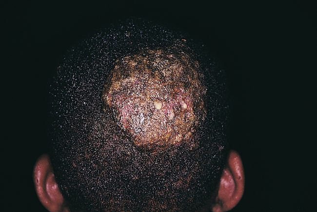 Rụng tóc từng mảng (có thể để lại sẹo) Da đầu Tổn thương mụn mủ. Da đầu sưng phồng. Nuôi cấy trong DTM Phổ biến nhất ở trẻ em Nhiễm nấm Nhiễm khuẩn