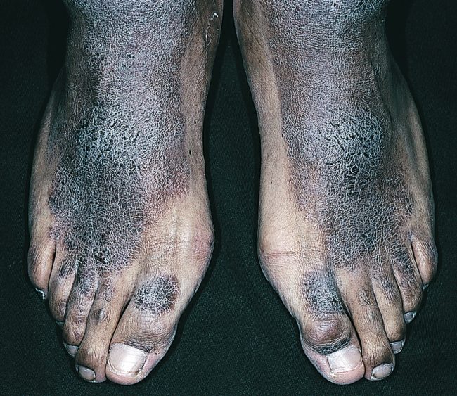 Vảy ban đỏ Bàn chân (mu bàn chân và các ngón chân; kẽ ngón chân và lòng bàn chân không bị ảnh hưởng) Xét nghiệm KOH âm tính Người lớn và trẻ em Nấm chân Viêm da do giày do crom được sử dụng trong thuộc da