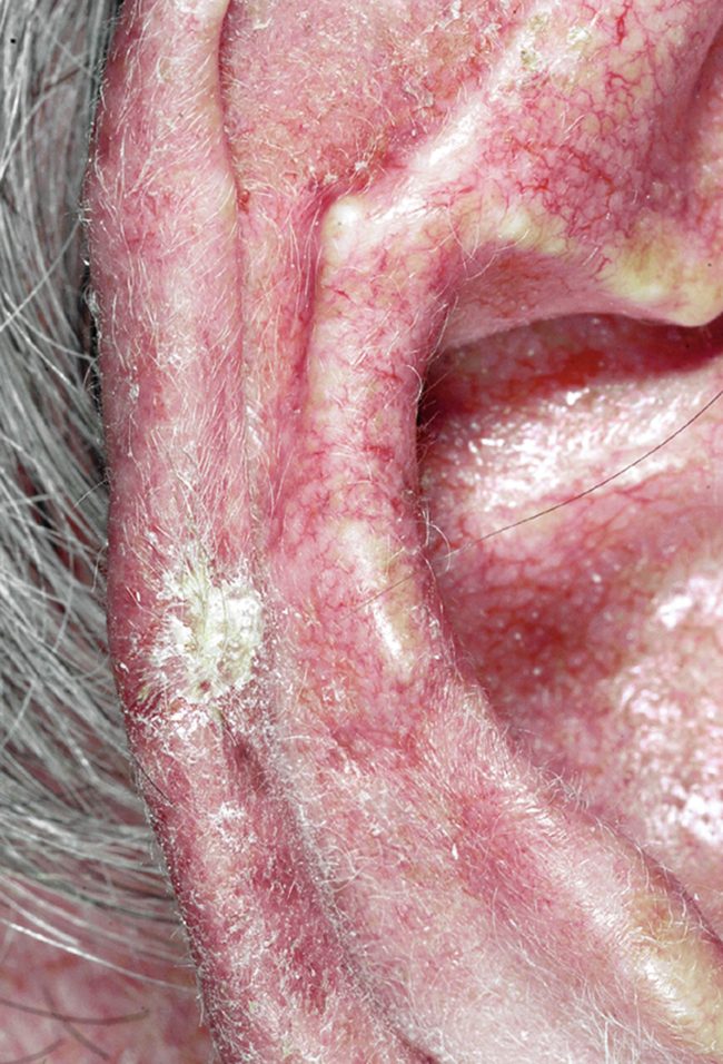 Phổ biến nhất ở các vùng tiếp xúc với ánh nắng mặt trời (đặc biệt là bàn tay, mặt và tai) Bề mặt nhẵn hoặc không đều. Chắc. Bờ không đều. Có thể có vảy. Màu nâu vàng Người già. Những người thường xuyên tiếp xúc với ánh nắng mặt trời Ung thư biểu mô tế bào đáy. Mụn cóc. Dày sừng quang hóa Ung thư biểu mô tế bào vảy