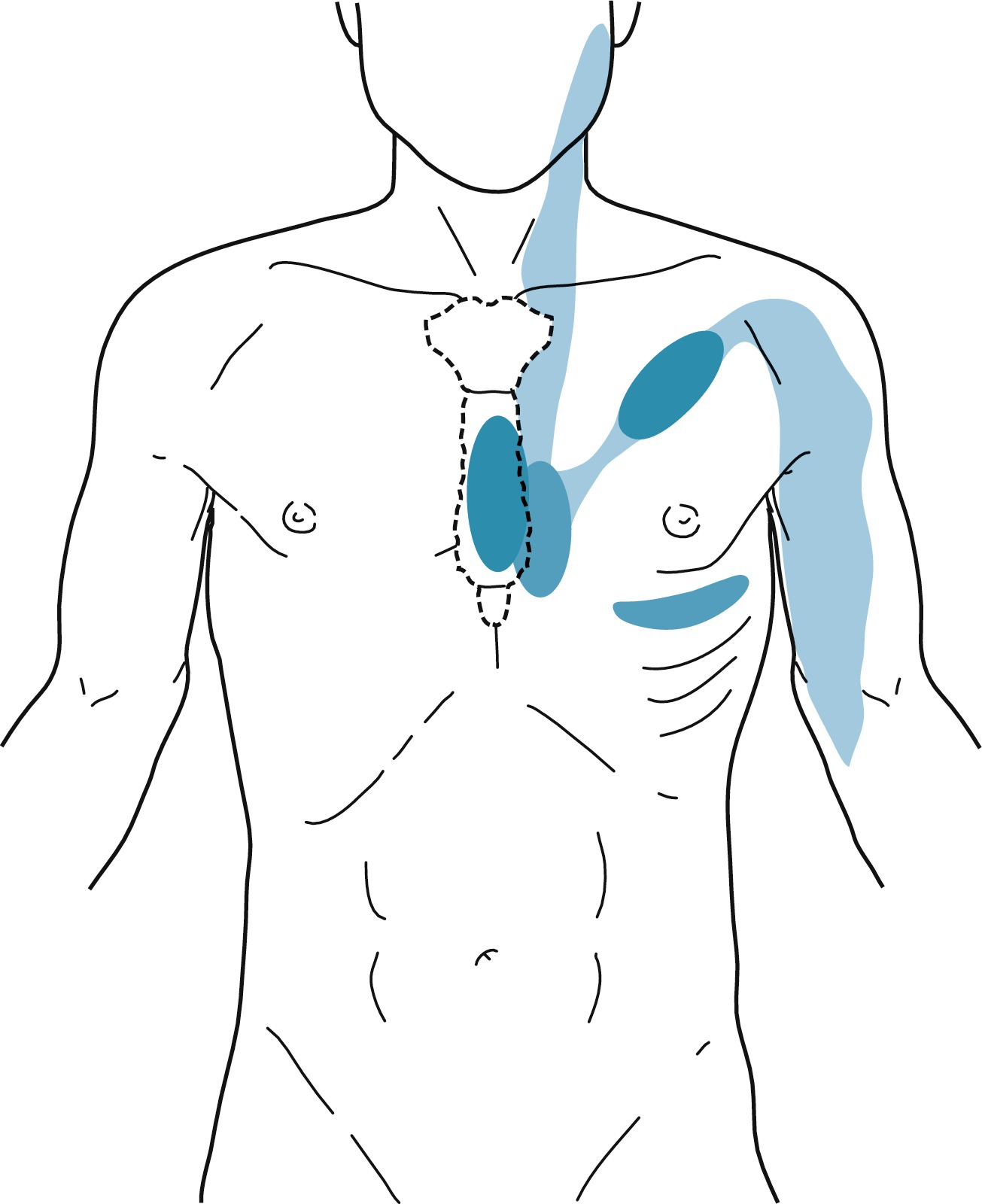 Hình 6.1: Các vùng của ngực trước nơi cơn đau tự phát thường được cảm nhận nhất và nơi có thể gây ra ấn đau được thể hiện bằng các sắc thái xanh dương. Các vùng màu xanh dương nhạt biểu thị sự lan tỏa của cơn đau.