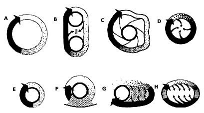 Biểu đồ các vòng vào lại có thể có. Mũi tên đen đậm biểu hiện xung động chuyển động vòng tròn; đường đen mỏng thể hiện mặt đầu sóng chuyển động về phía trước trong tổ chức trơ hoàn toàn; các khu vực lôm đốm nhỏ là tổ chức trơ một phần; khu vực màu trắng là tổ chức có thể kích thích đầy đủ. A là mô hình nguyên bản của vòng chuyển động quanh tắc nghẽn cố định. Có khoảng có thể kích thích đầy đủ và chiều dài và khu vực vòng cố định. B biểu hiện vòng chuyển động quanh hai chỗ tắc nghẽn giải phẫu cố định. Khoảng có thể kích thích đầy đủ được biểu hiện. C biểu hiện dẫn truyền bó nhanh hình thành mạch khép kín đóng vai trò một vòng ưu tiên qua đó xung động có thể di chuyển. D là loại vòng tròn vào lại có hướng không đòi hỏi tắc nghẽn giải phẫu, xung động dẫn truyền quanh trung tâm trơ chức năng và dọc theo các sợi bên cạnh có đặc tính điện sinh lý khác nhau. Khi trơ của trung tâm thay đổi, kích thước vòng thay đổi, nhưng sẽ là vòng nhỏ nhất nó có thể tiếp tục dẫn truyên xung động. Các vòng chức năng xu hướng trở nên nhỏ, nhanh và không ổn định. E biểu thị vào lại quanh tắc nghẽn giải phẫu cố định nhưng khoảng thời gian có thể kích thích đầy đủ là không có. F chứng minh khu vực của dẫn truyền chậm (các đường gạch) giữa các ranh giới giải phẫu, trong khi ở G tất cả các khu vực của dẫn truyền chậm ngay cạnh tắc nghẽn giải phẫu. H thể hiện vào lại đẳng hướng. Có sự khác biệt trong dẫn truyền của xung động đơn trong các sợi khác nhau như là kết quả của sự khác biệt trong hướng của chúng.