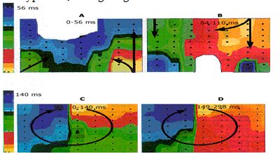 Các bản đồ hoạt động đẳng thời chứng minh hai typ vào lại trong rung nhĩ. Bản đồ A chỉ ra vào lại ngẫu nhiên với 3 mặt sóng tự phát (các mũi tên màu đen) hoạt hóa hầu hết khu vực ghi nhận. Bản đồ B chỉ 3 mặt sóng tự phát, nhưng đến từ các hướng khác nhau so với ở bản đồ A. Bản đồ C và D chỉ ra hai vòng vào lại hoàn chỉnh liên tục. Sóng hoạt hóa (mũi tên đen) lan truyền theo chiều kim đồng hồ theo kiểu quanh tổ chức không thể kích thích. Reproduced with permission from Holm M, Johansson R, Brandt J, et al. Eur Heart J 1997; 18:290.