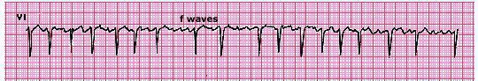 Các sóng F không xuất hiện ở chuyển đạo này, khi đó chỉ dẫu hiệu gợi ý rung nhĩ đó là đáp ứng thất không theo quy luật không đều. Courtesy of Morton Arnsdorf, MD.