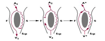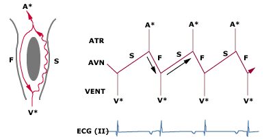 Biểu thị sinh lý đường kép liên quan đến nút AV và tổ chức nhĩ quanh nút ở hình thái phổ biến của AVNRT. Ô trái: A nhắt bóp xoang bình thường (A1) được dẫn truyền qua đường nhanh (F) đến đến đường thông thường kết thúc (final common pathway: fcp) trong nút AV và đi vào bó His. Dẫn truyền qua đường chậm (S) chạy vào giai đoạn trơ của xung động qua đường nhanh và bị tan biến. Ô giữa: A nhát bóp nhĩ sớm đã được chọn thời gian quyết định (A2) nhận được thời gian trơ của đường nhanh nhưng có thể dẫn truyền qua đường chậm có thời kỳ trơ ngắn hơn. Nếu tính dễ kích thích trong đường nhanh được phục hồi đúng thời gian xung đạt được đường thong thường kết thúc (fcp), ở đây có thể được hoạt hóa ngược theo đường nhanh. Ô phải: xung ngược đi đội ngược lại nhĩ (A*), và, nếu đường chậm được phục hồi khả năng kích thích, xung động đi vào trở lại đường chậm và tạo ra khử cực thất V*. Nếu cơ chế tiếp tục tồn tại, vòng lặp lại được thiết lập tạo ra nhịp nhanh vào lại dai dẳng. Một chuỗi dẫn truyền xuôi (S) và ngược (F) được gọi là hình thái chậm nhanh của AVNRT.