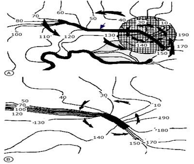 Ô A bản đồ hoạt động của vòng vào lại đơn ở vùng gianh giới thượng tâm mạc của nhồi máu cơ tim. Các mũi tên lớn biểu thị mẫu hoạt động thông thường xuất hiện quanh đường dài của blốc (mũi tên xanh). Các đường đẳng thời (Parallel isochrones) 130 và 140 ngay sát với blốc gợi ý hoạt động đang xuất hiện qua blốc, dẫn đến kết quả vòng nhỏ hơn (khu vực tối màu) chỉ ra bằng các mũi tên màu đen nhỏ. Ô B biểu hiện khu vực sẫm màu này giãn lớn; hình chữ nhật đen tối màu biểu thị khu vực blốc quanh có vòng vào lại (mũi tên nhỏ). Hoạt động nhanh xuất hiện song song trục dài của hướng sợi (đường đẳng thời 10-40 và 130-150), trong khi hướng ngang hoạt động chậm ( các đường đẳng thời chùm 50-120).