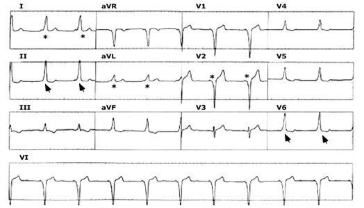 12 chuyển đạo ECG cho thấy các đặc tính điển hình của hội chứng Wolff-Parkinson-White; khoảng PR ngắn (*) và khoảng thời gian QRS bị kéo dài như là kết quả của sóng delta (mũi tên), cho thấy kích thích sơm thất. Courtesy of Martin Burke, DO.