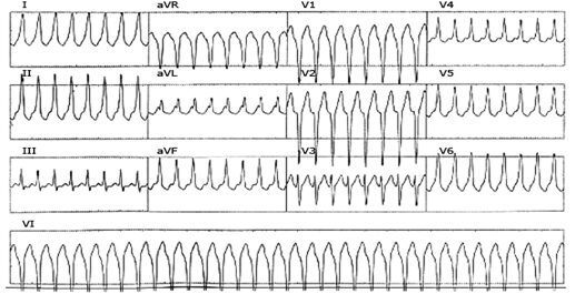 12 chuyển đạo ECG của bệnh nhân có hội chứng Wolff-Parkinson-White cho thầy nhịp nhanh đều. Các phức bộ QRS giãn rộng và có thể nhận biết các phức bộ QRS ở nhịp xoang; dẫn truyền xuôi đến thất qua đường phụ và dẫn truyền ngược qua đường His nút nhĩ thất bình thường. Do đó đây là nhịp nhanh vào lại nhĩ thất thể antidromic hoặc AAVRT. Courtesy of Martin Burke, DO.