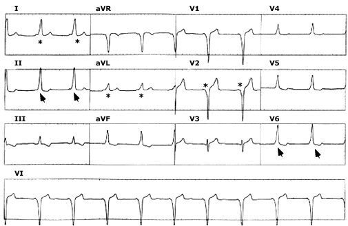 12 chuyển đạo ECG nhận thấy các đặc tính điển hình của hội chứng Wolff-Parkinson-White; khoảng PR ngắn (*) và khoảng thời gian QRS kéo dài do có sóng delta (mũi tên), chỉ ra kích thích thất sớm. Courtesy of Martin Burke, DO.