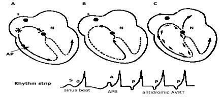 Khi nhận thấy trên băng nhịp, nhắt bóp xoang (S) có khoảng PR ngắn và phức bộ QRS giãn rộng do sóng delta (d). Ô A cho thấy chuỗi hoạt hóa với nhắt bóp nhĩ sớm (APB,*). Xung động đạt được nút nhĩ thất (N) trước khi trước khi nó được khử cực và do đó bị blốc ở cấu trúc này. Tuy nhiên, đường phụ (AP), có thời kỳ trơ kéo dài, có khả năng để dẫn xung động xuôi, gây ra nhắt bóp nhĩ sớm với hình thái QRS giãn rộng giống như nhắt bóp xoang. Khi nhận thấy ở ô B, tiếp theo hoạt hóa cơ tim, xung động được dẫn ngược lên theo hệ thống His Purkinje và nút AV, gây ra hoạt động nhĩ ngược, nhận thấy trên băng nhịp với sóng P lộn ngược. Nếu chuỗi hoạt động này tự bản than nó lắp lại (ô C), nhịp nhanh vào lại nhĩ thất phức hợp QRS rộng thể antidromic được hình thành (AVRT).