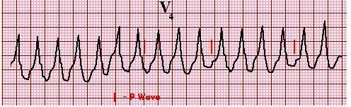Ba hay nhiều hơn các nhắt bóp thất liên tiếp được xác định như là nhịp nhanh thất (VT). Nhịp nhanh thất này là đơn hình do tất cả các phức bộ QRS có biểu hiện đồng nhất. Mặc dù các sóng P là không dễ nhận biết, chúng có thể nhận biết làm thay đổi phức bộ QRS và các sóng ST-T với hình thái đều, chỉ ra sự vắng mặt mối liên hệ các sóng P và phức bộ QRS, như vậy có phân ly nhĩ thất.