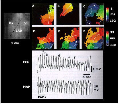 Các ô trên đỉnh của mẫu A-F của các bản đồ đẳng thời thượng tâm mạc thu được từ bề mặt thành thất trước trái và thành tự do của thất phải trong cơn torsades de pointes được tạo ra do quinindine. Mỗi bản đồ tương đương với độ lệch hướng QRS của ECG bề mặt và điện thế hoạt động đồng thời một pha (monophasic action potential: MAP). Hậu điện thế sớm (Early afterpotentials: EADs) đưa đến hoạt động khởi phát (các ô A-C) được tiếp theo bằng cơn dài vào lại như xoẵn ốc (các ô D-F). Ô C chỉ ra sóng vào lại đầu tiên là không ổn định, nhưng di chuyển đi lên từ từ và về bên phải. Điều này kết hợp với giảm đi từ từ trong biên độ của phức hợp QRS. Reprinted with permission from the American College of Cardiology. Journal of the American College of Cardiology, 1997; 29:831.