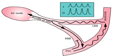 Biểu diện mô hình của vòng vào lại trong nhịp nhanh vào lại nhánh bó chỉ ra nhắt bóp thất sớm nó bị blốc ở nhánh bó phải, dẫn trruyền chậm lên nhánh bó trái, hoạt hóa bó His, và trở lại xuôi xuống bó nhánh phải. Nếu bó nhanh phải đã phục hồi khả năng chịu kích thích của nó từ nhắt bóp đi trước, vòng được hoàn chỉnh và vòng vào lại có thể trở nên được lặp lại. Điện tâm đồ ghi được nhận thấy mẫu blốc nhánh trái ở chuyển đạo I và II.