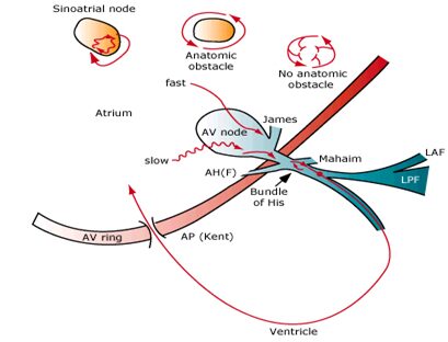 Vào lại có thể xuất hiện quanh tắc nghẽn giải phẫu cố định hoặc có thể là chức năng, phát triển trong không có tắc nghẽn giải phẫu và do không đồng nhất nội tại của các đặc tính điện sinh lý của tổ chức cơ tim. Các vòng vào lại hướng đến nhip nhanh trên thất có thể phát triển ở các phần khác nhau của tim: trong phạm vi và quanh nút xoang nhĩ (vào lại nút xoang); trong phạm vi cơ nhĩ (nhịp nhanh nhĩ, cuồng nhĩ, hoặc rung nhĩ); trong phạm vi nhĩ thất (nút nhĩ thất) do hiện diện của đường nhanh và chậm (nhịp nhanh vào lại nút nhĩ thất); hoặc liên quan đến nút nhĩ thất và đường phụ (accessory pathway:AP) (nhịp nhanh vào lại nhĩ thất: atrioventricular reentrant tachycardia) bao gồm các sợi Kent, Mahaim, James, và nhĩ His (atriohisian: AH).