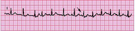 Hai phức bộ đầu tiên là nhắt bóp bình thường có sóng P bình thường tiếp sau là phức hợp QRS. Phức bộ thứ ba, nhắt bóp nhĩ sớm (APB), có khoảng PR kéo dài; nó khởi đầu nhịp nhanh vào lại nhĩ thất thường gặp hai điển hình trong đó dẫn truyền xuôi đến thất do đường chậm và hoạt hóa nhĩ ngược bằng đường nhanh. Mặc dù không có sự khác biệt của sóng P được nhận thấy, phức bộ QRS có sự lệch hướng nhỏ ở chỗ kết thúc, được biết như là sóng r’ giả (pseudo r’), trong đó sóng P chồng lên trên phần cuối cùng của phức bộ QRS.