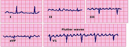 ECG trong cuống nhĩ điển hình ngược chiều kim đồng hồ typ I. Các sóng cuồng nhĩ (F) hai pha âm chiếm ưu thế (chuyển đạo II) trong cuồng nhĩ điển hình ngược chiều kim đồng hồ. Bệnh nhân đang sử dụng ức chế beta có dẫn truyền 4:1.
