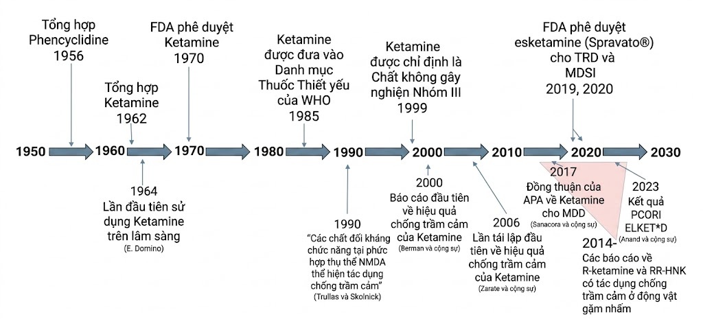 Song song đó, ngày càng có nhiều bằng chứng khác cho thấy hệ thống dẫn truyền thần kinh glutamatergic (glutamatergic neurotransmitter system) có thể đóng một vai trò quan trọng trong sinh lý bệnh của rối loạn trầm cảm nặng (major depressive disorder - MDD). Các nhà khoa học đã báo cáo nồng độ glutamate ngoại bào gia tăng và những thay đổi trong quá trình vận chuyển màng của NMDAR, ngoài các thụ thể alpha-amino-3-hydroxy-5-methyl-4-isoxazolepropionic acid (AMPA), nhằm đáp ứng với tình trạng stress cấp tính trên các mô hình động vật. Các nghiên cứu khác đã tìm thấy bằng chứng chứng minh tình trạng stress mạn tính điều chỉnh sự điều hòa glutamate bên trong vỏ não trước trán (prefrontal cortex - PFC). Cùng với nhau, những phát hiện này gợi ý một vai trò gây bệnh có thể có của độc tính liên quan đến glutamate (glutamate-related toxicity) trong các rối loạn khí sắc (mood disorders). Bằng chứng ngày càng tăng cho thấy trầm cảm là một rối loạn chức năng vỏ não-hệ viền (cortico-limbic function), với sự điều hòa chủ yếu bởi glutamatergic và gamma-aminobutyric acid (GABA)-ergic. Kết hợp với bằng chứng về những thay đổi trong dẫn truyền thần kinh glutamatergic liên quan đến sinh lý bệnh của các rối loạn khí sắc, điều này đã truyền cảm hứng cho nghiên cứu nền tảng của Berman và cộng sự. Họ đã khám phá tác dụng chống trầm cảm tiềm năng của ketamine, với tư cách là một chất đối kháng NMDAR không cạnh tranh có ái lực cao (high-affinity non-competitive NMDAR antagonist). Xem bên dưới để biết phần thảo luận chi tiết về các thử nghiệm lâm sàng kiểm tra tác dụng chống trầm cảm của ketamine. Hình dưới đây trình bày dòng thời gian về sự phát triển và nghiên cứu ketamine từ góc độ của bệnh trầm cảm (Hình 6.1).